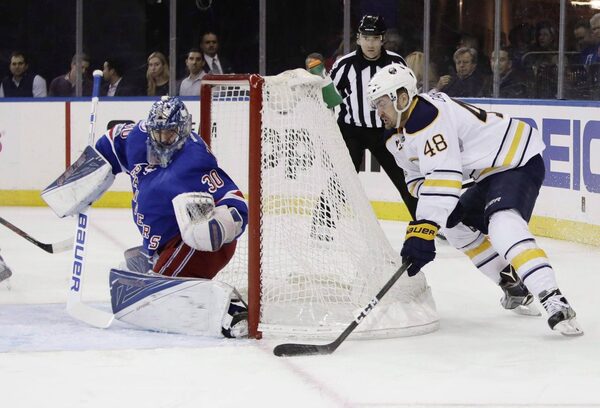 New York Rangers goalie Henrik Lundqvist defends the goal as Buffalo Sabres' William Carrier attempts to score during the first period of an NHL hockey game in New York, on Jan. 3, 2017.Frank Franklin II/The Associated Press
