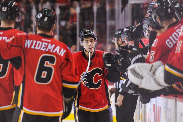 Johnny Gaudreau of the Calgary Flames celebrates with the bench after scoring against the New York Rangers on December 12, 2015 in Calgary.Derek Leung/Getty Images