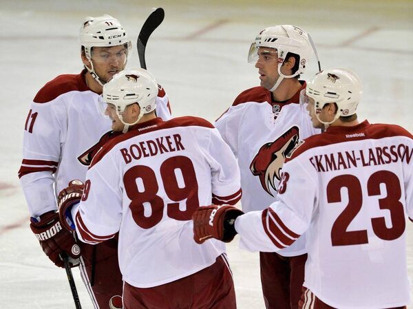 Phoenix Coyotes right wing Mikkel Boedker (89) celebrates with teammates after scoring a goal in the first period goal against the Edmonton Oilers at Rexall Place.Chris Austin