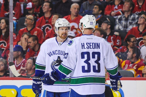 Daniel Sedin #22 (L) and Henrik Sedin #33 of the Vancouver Canucks confer during a stoppage in play against the Calgary Flames in Game Three of the Western Quarterfinals during the 2015 NHL Stanley Cup Playoffs at Scotiabank Saddledome on April 19, 2015 in Calgary, Alberta.Derek Leung/Getty Images