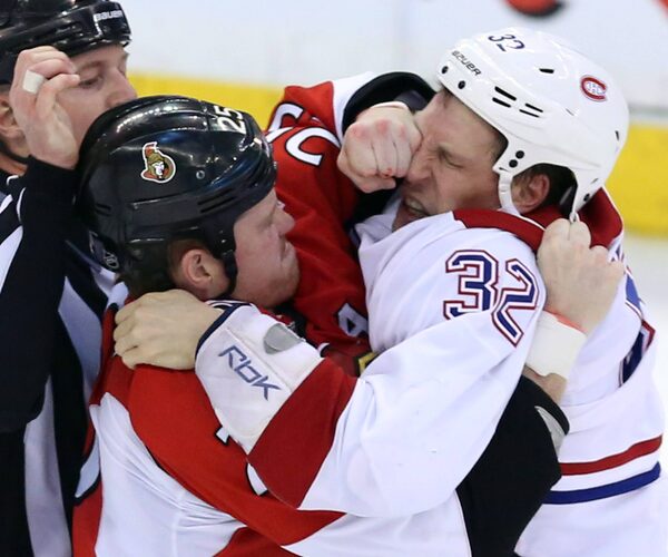 Ottawa Senators' Chris Neil (25) fights with Travis Moen (32) during the third period of game three of the first round of Stanley Cup hockey action on May 5, 2013 in Ottawa. Ottawa beat Montreal 6-1.The Canadian Press