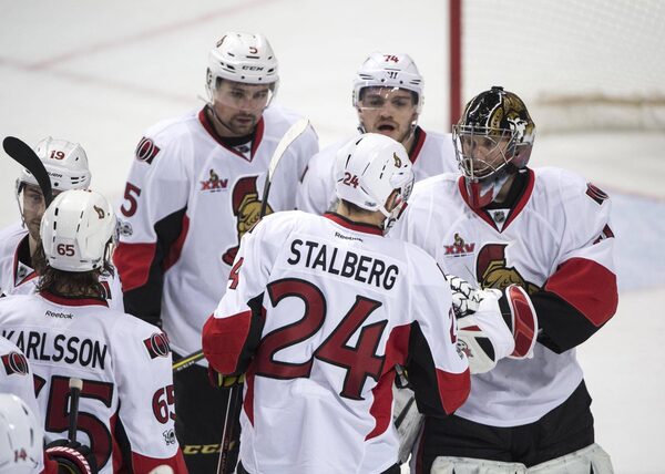 Ottawa Senators celebrate the win over the Dallas Stars at the American Airlines Center.Jerome Miron