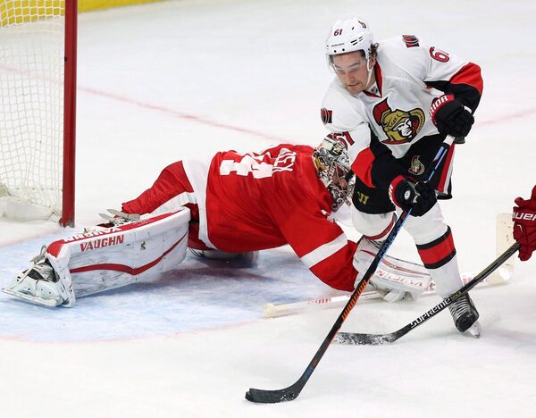 Ottawa Senators' Mark Stone (16), right, attempts to get the puck around Detroit Red Wings' goaltender Petr Mrazek (34) during third period NHL hockey action, in Ottawa, on Saturday, Oct. 31, 2015. The NHL has suspended Stone two games for an illegal hit to the head of Detroit Red Wings forward Landon Ferraro.FRED CHARTRAND/The Canadian Press