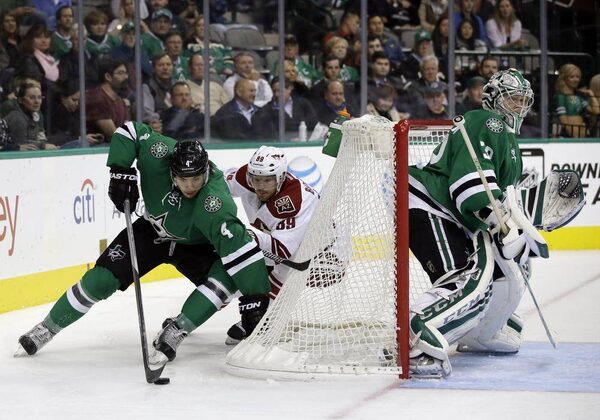 Dallas Stars defenceman Brenden Dillon clears the puck under pressure from Arizona Coyotes' Mikkel Boedker , in the second period of an NHL hockey game, Thursday, Nov. 20, 2014, in Dallas.Tony Gutierrez/The Associated Press