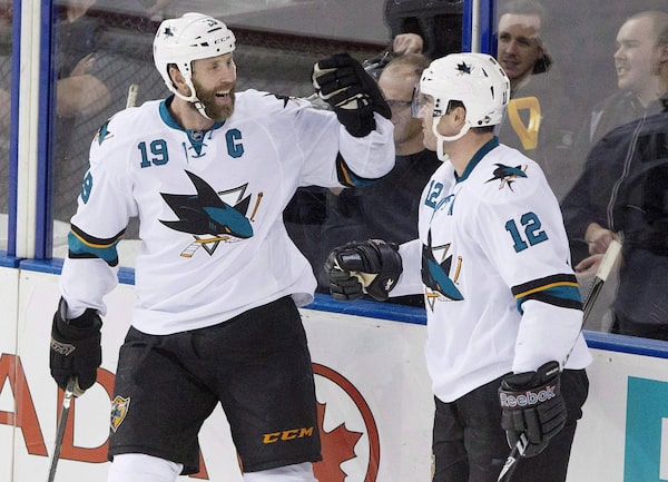 San Jose Sharks' Joe Thornton and Patrick Marleau celebrate a goal against the Edmonton Oilers on Friday November 15, 2013.JASON FRANSON/The Canadian Press