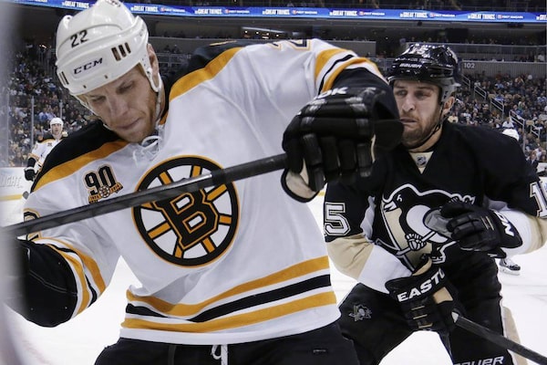 Pittsburgh Penguins' Tanner Glass prepares to check Boston Bruins' Shawn Thornton into the boardsGene J. Puskar/The Associated Press