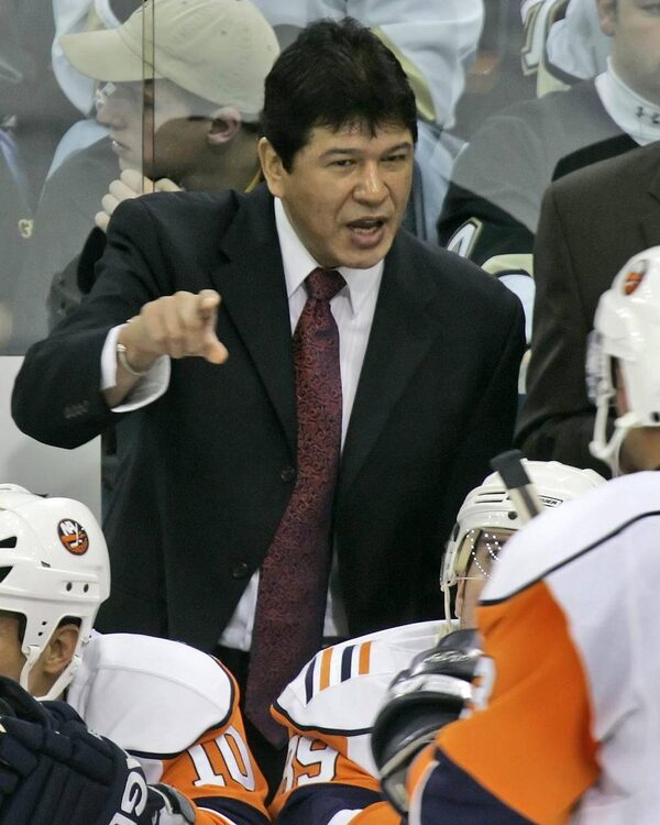 In this Nov. 15, 2007 file photo, New York Islanders coach Ted Nolan talks with his players during a timeout late in the third period of an NHL hockey game against the Pittsburgh Penguins in Pittsburgh. The Buffalo Sabres have fired coach Ron Rolston and rehired Ted Nolan to replace him. Sabres owner Terry Pegula also announced Wednesday, Nov. 13, 2013, that he fired general manager Darcy Regier and hired Pat LaFontaine as president of hockey operations.GENE J. PUSKAR/The Associated Press