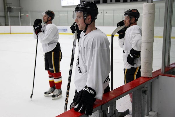 Calgary Flames' Matt Stajan, centre, looks during an informal skate in Calgary, Alta., Thursday, Jan. 10, 2013.Jeff McIntosh/The Canadian Press