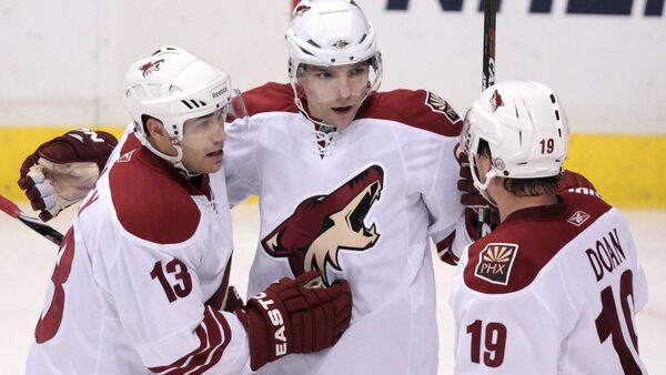 Phoenix Coyotes' Ray Whitney, from left, Radim Vrbata, of the Czech Republic, and Shane Doan celebrate Vrbata's goal against the Vancouver Canucks during the third period of an NHL hockey game in Vancouver, B.C., on Friday March 18, 2011.DARRYL DYCK