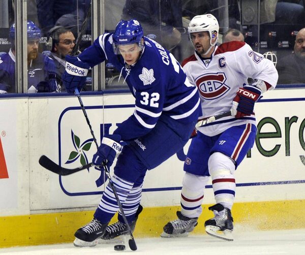 Toronto Maple Leafs forward Joe Colborne skates with the puck past Montreal Canadiens forward Brian Gionta (R) during the first period of their NHL hockey game in Toronto April 9, 2011. REUTERS/Mike Cassese (CANADA - Tags: SPORT ICE HOCKEY)MIKE CASSESE/Reuters