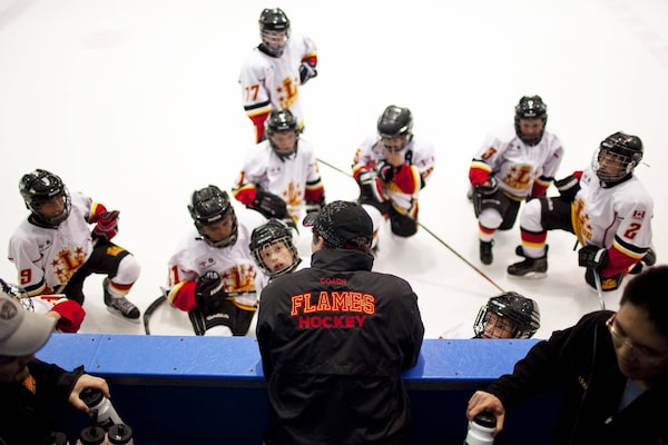 Minor Pee Wee AA players from the Leaside Flames listen to their coach during a GTHL hockey game at St. Michael's arena on Sept. 30, 2011.Della Rollins/The Globe and Mail