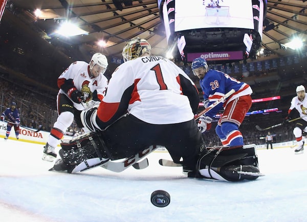 Chris Kreider scores a third period goal against Mike Condon of the Ottawa Senators in Game Four of the Eastern Conference Second Round.Bruce Bennett/Getty Images