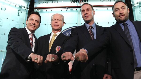 2011 Hall of Fame inductees Doug Gilmour, Mark Howe, Joe Nieuwendyk and Ed Belfour show off their Hall of Fame rings during a photo opportunity at the Hockey Hall of Fame on Monday.Bruce Bennett