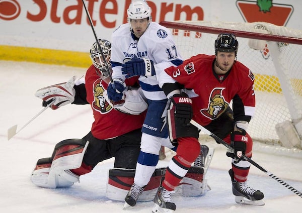 Lightning centre Alex Killorn squeezes between Senators goalie Robin Lehner and defenceman Marc Methot.Adrian Wyld/The Canadian Press