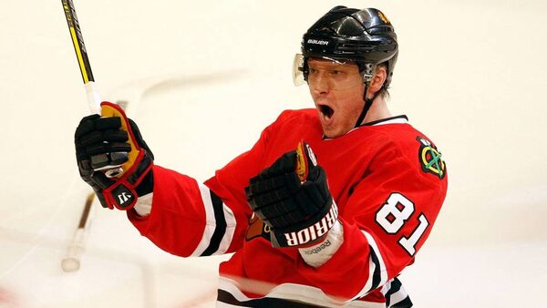Marian Hossa of the Chicago Blackhawks celebrates scoring the game-winning goal against the Nashville Predators in Game Five of the Western Conference Quarterfinals during the 2010 NHL Stanley Cup Playoffs at the United Center on April 24, 2010 in Chicago, Illinois. The Blackhawks defeated the Predators 5-4 in overtime.Jonathan Daniel/Getty Images