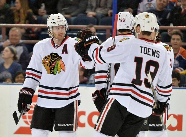 Chicago Blackhawks center Jonathan Toews (19) gives a high five to defenceman Duncan Keith (2) after Keith scored in the second period against the Edmonton Oilers at Rexall Place on Nov 22, 2014.Chris LaFrance