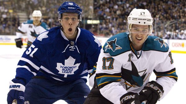 Toronto Maple Leafs Jake Gardiner (L) and San Jose Sharks Torrey Mitchell race for the puck into the end boards during the first period of their NHL hockey game in Toronto February 23, 2012.FRED THORNHILL/Reuters