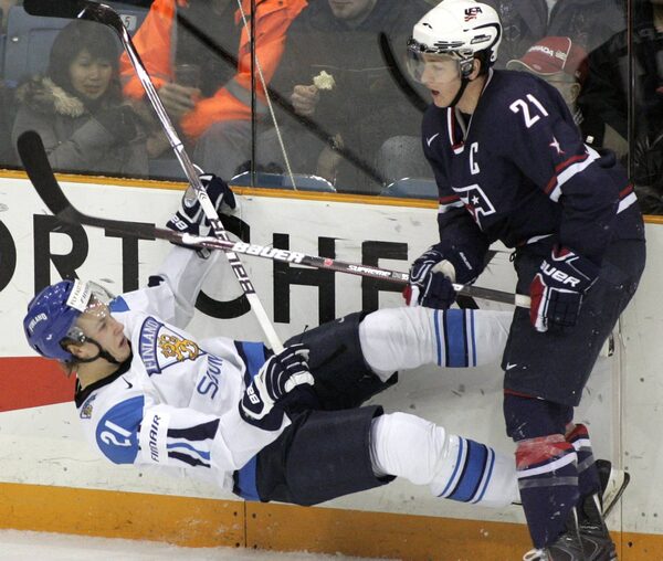 Team Finland's Jasse Ikonen, left, is sent flying by Team USA's Derek Stepan during second period quarter final world junior hockey championship action in Saskatoon, Sask., Saturday, Jan. 2, 2010. THE CANADIAN PRESS/Geoff HoweGEOFF HOWE/The Canadian Press
