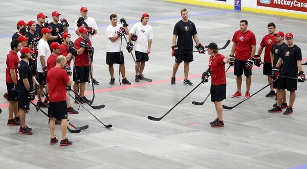 Head coach Mike Babcock, from Saskatoon, Sask., gives instruction during a ball hockey training session at the Canadian national men's team orientation camp in Calgary, Alta., Monday, Aug. 26, 2013.Jeff McIntosh/The Canadian Press