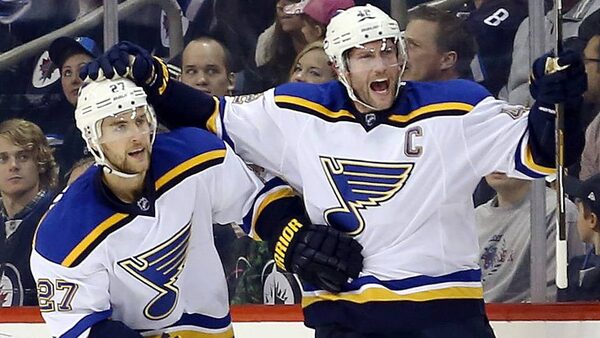 St. Louis Blues forward David Backes, right, celebrates with teammates after scoring on Winnipeg Jets goalie Ondrej Pavelec (not shown) during the second period at MTS Centre.