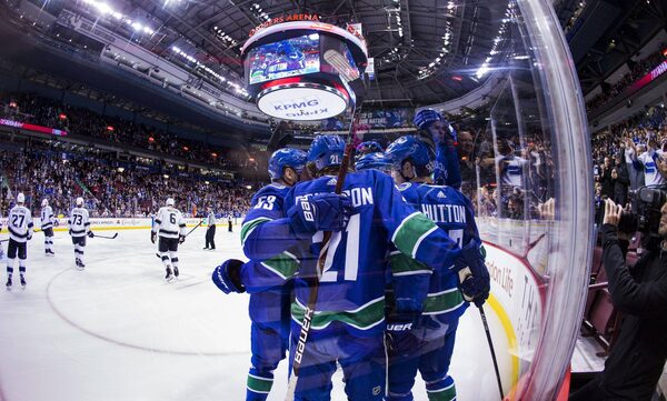 Vancouver Canucks players Bo Horvat, Loui Eriksson and Ben Hutton celebrate their goal against the Los Angeles Kings on Jan. 23, 2018.Bob Frid