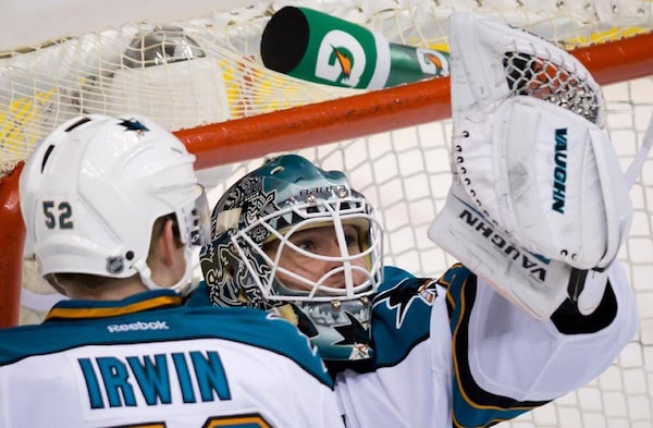 San Jose Sharks' goalie Antti Niemi, of Finland, makes a glove save against the Vancouver Canucks as Matt Irwin, left, watches during the third period in game 1 of an NHL Western Conference quarter-final playoff hockey series in Vancouver, B.C., on Wednesday May 1, 2013.DARRYL DYCK/The Canadian Press