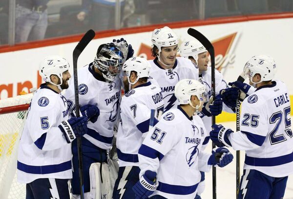 Tampa Bay Lightning goalie Ben Bishop (30) is congratulated by teammates after they defeat the Winnipeg Jets at the MTS Centre. Tampa Bay win 4-2.Bruce Fedyck