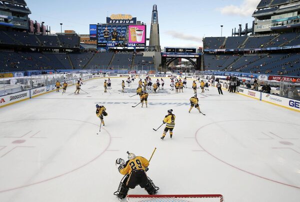 The current look of the Winter Classic really took shape on New Year's Day, 2008, when the Sabres hosted the Pittsburgh Penguins at Ralph Wilson Stadium, the home of the NFL's Buffalo Bills. (Pittsburgh won 2-1 on Sidney Crosby's clincher in the shootout.) Snow flurries added to the wintry feel, and the teams switched sides midway through the third period (and again in overtime) to neutralize any advantage gained by wind or sun.