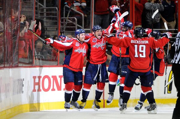 Alex Ovechkin #8 of the Washington Capitals celebrates with teammates after scoring in the second period against the New York Islanders during Game Two of the Eastern Conference Quarterfinals during the 2015 NHL Stanley Cup Playoffs at Verizon Center on April 17, 2015 in Washington, DC.Greg Fiume/Getty Images