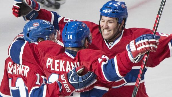 Montreal Canadiens' Tomas Plekanec, centre, celebrates with teammates Brandon Prust, right, and Brendan Gallagher after scoring against the Tampa Bay Lightning during third period NHL Stanley Cup playoff action in Montreal, Sunday, April 20, 2014.The Canadian Press