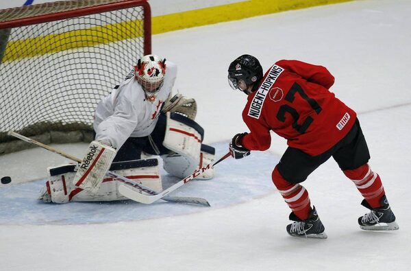 Goalie Jake Peterson makes a save on Ryan Nugent-Hopkins during the red-white team game at the Team Canada selection camp in Calgary, Alberta, December 11, 2012.TODD KOROL/Reuters