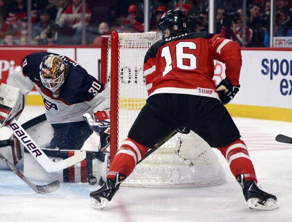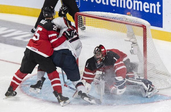 Canada's Darnell Nurse, right, is stopped by USA's goaltender Thatcher Demko during second period preliminary round hockey action at the IIHF World Junior Championship, Wednesday, December 31, 2014 in Montreal.Ryan Remiorz/The Canadian Press