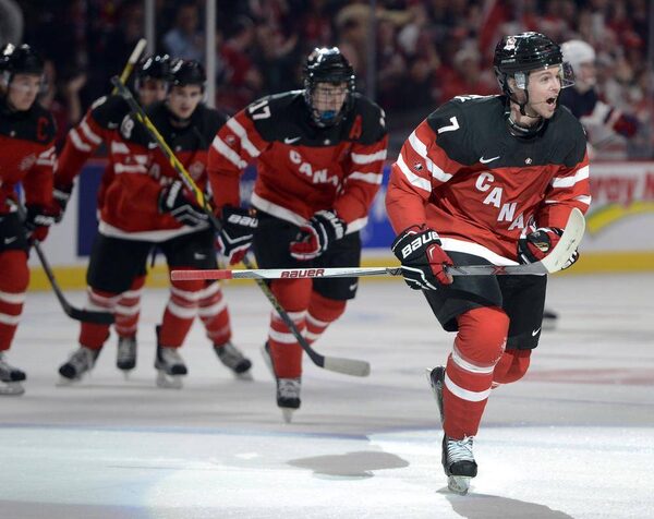 Canada's Josh Morrissey, right, celebrates after scoring the second goal against the USA during second period preliminary round hockey action at the IIHF World Junior Championship Wednesday, December 31, 2014 in Montreal.Ryan Remiorz/The Canadian Press