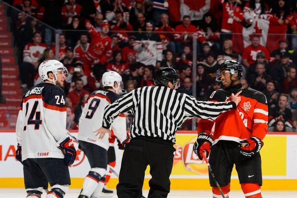 The linesman separates Anthony DeAngelo of Team United States and Anthony Duclair of Team Canada during the 2015 IIHF World Junior Hockey Championship game at the Bell Centre on December 31, 2014 in Montreal.Minas Panagiotakis/Getty Images