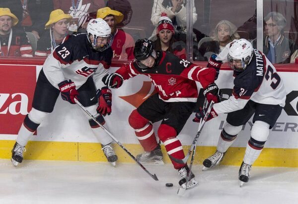 Canada's Curtis Lazar tries to control the puck away from USA's Zach Werenski, left, and Auston Matthews during first period preliminary round hockey action at the IIHF World Junior Championship, Wednesday, December 31, 2014 in Montreal.Paul Chiasson/The Canadian Press