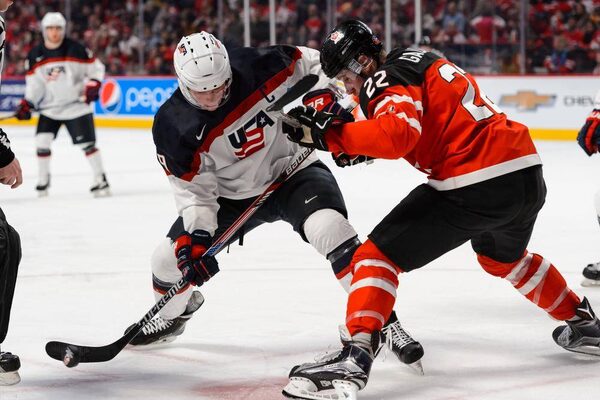 Jack Eichel of Team United States and Frederik Gauthier of Team Canada take a face-off in a preliminary round game during the 2015 IIHF World Junior Hockey Championships at the Bell Centre.Minas Panagiotakis/Getty Images