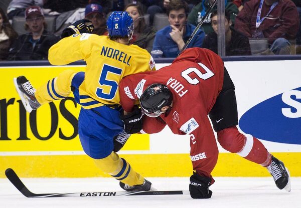 Sweden defenceman Robin Norell collides with Switzerland defenceman Michael Fora during second period preliminary round hockey action at the IIHF World Junior Championship in Toronto on Wednesday, December 31, 2014.Nathan Denette/The Canadian Press