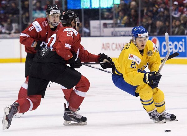 Sweden forward William Nylander skates past Switzerland defenceman Simon Kindschi during second period preliminary round hockey action at the IIHF World Junior Championships in Toronto on Wednesday, December 31, 2014.Nathan Denette/The Canadian Press