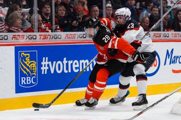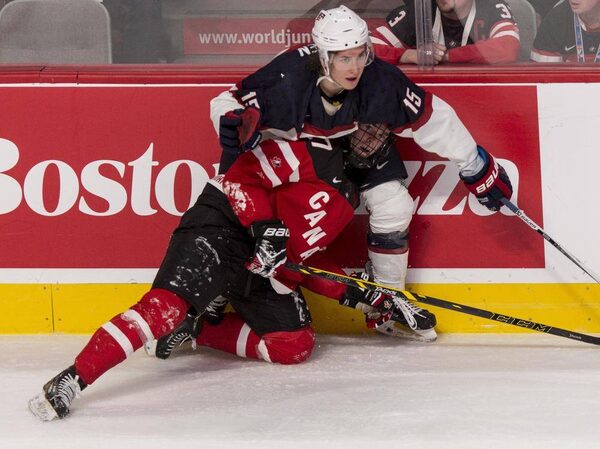Zach Werenski of Team United States challenges Lawson Crouse of Team Canada near the boards during the 2015 IIHF World Junior Hockey Championship game at the Bell Centre.Minas Panagiotakis/Getty Images