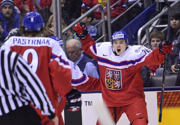 Czech Republic's Patrik Zdrahal (right) celebrates his goal against Russia with teammate David Pastrnak (left) during first period preliminary round hockey action at the IIHF World Junior Championship in Toronto on Wednesday, Dec.31, 2014.Frank Gunn/The Canadian Press