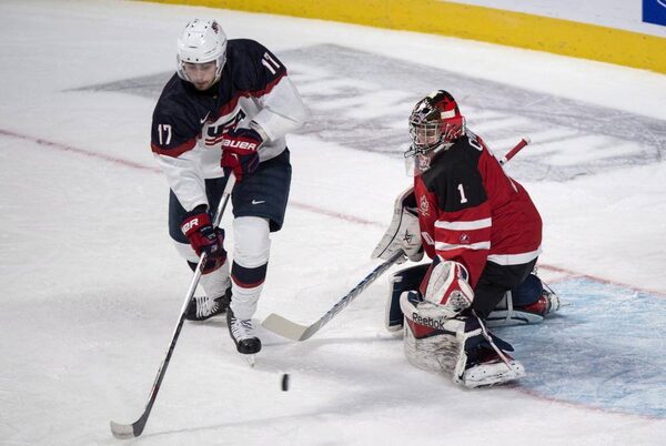 USA's Alex Tuch tries to deflect a shot past Canada's goaltender Eric Comrie during first period preliminary round hockey action at the IIHF World Junior Championship, Wednesday, December 31, 2014 in Montreal.Paul Chiasson/The Canadian Press