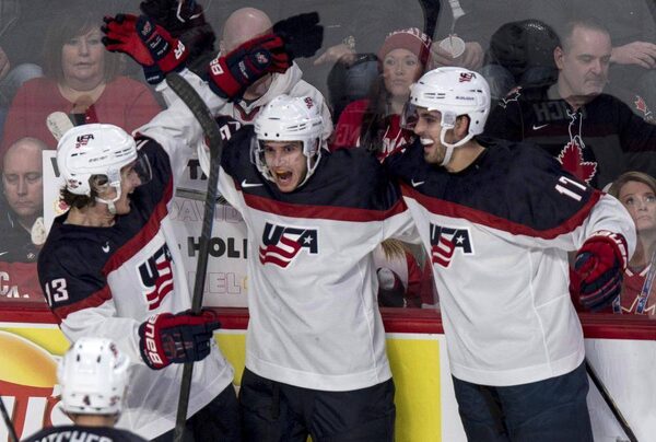 USA's Anthony DeAngelo, centre, is congratulated by teammates Sonny Milano, left, and Alex Tuch on a goal against Canada during second period preliminary round hockey action at the IIHF World Junior Championship Wednesday, December 31, 2014 in Montreal.Paul Chiasson/The Canadian Press