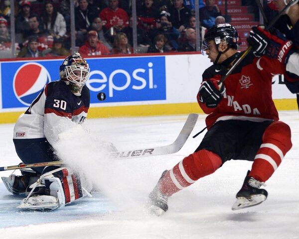 Canada goaltender Eric Comrie is sprayed as he makes a save off USA's Alex Tuch, covered by Canada defenceman Darnell Nurse, during first period hockey action at the IIHF World Junior Championship, Wednesday, December 31, 2014 in Montreal.Paul Chiasson/The Canadian Press