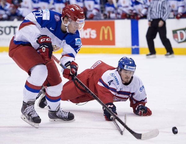 Czech Republic defenceman Jan Scotka (4) dives to break up a breakaway by Russia forward Ivan Barbashyov (22) during second period preliminary round hockey action at the World Junior Championships in Toronto on Wednesday, December31, 2014. AFrank Gunn/The Canadian Press