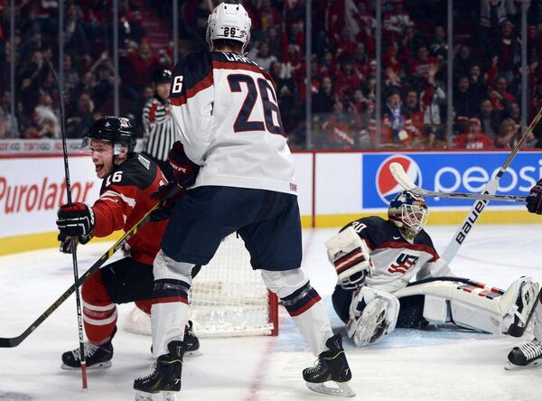 Canada's Max Domi, left, celebrates after scoring his team's first goal on USA's goaltender Thatcher Demko as USA's Brandon Carlo looks on during second period preliminary round hockey action at the IIHF World Junior Championship, Wednesday, December 31, 2014 in Montreal.Ryan Remiorz/The Canadian Press