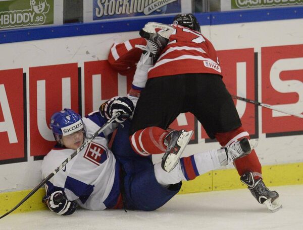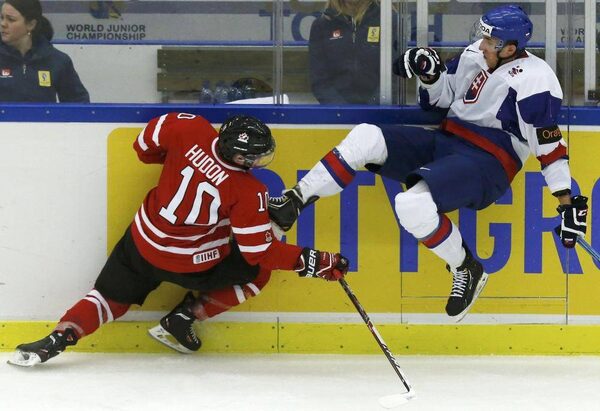 Canada's Charles Hudon checks Slovakia's Martin KeckesALEXANDER DEMIANCHUK/Reuters