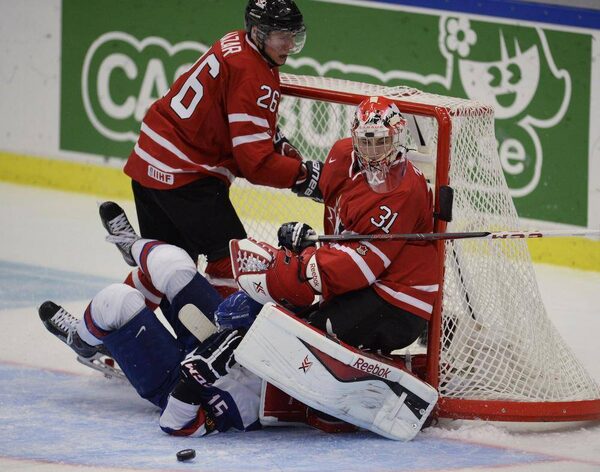 Slovakia's Mario Lunter slides into Canada's goaltender Zach Fucale as Curtis Lazar looks onFrank Gunn/The Canadian Press