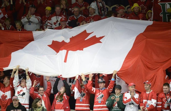 Fans hold up a huge Canadian flag during the Canada-Slovakia gameFrank Gunn/The Canadian Press