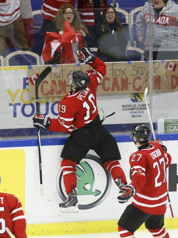 Canada forward Nic Petan is congratulated by teammates Derrick Pouliot, Jonathan Drouin and Curtis Lazar after scoring the game-winning goalFrank Gunn/The Canadian Press