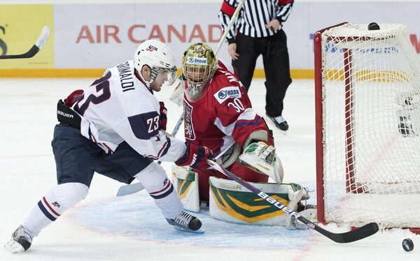 Team USA forward Rocco Grimaldi, left, gets stopped by Czech Republic goalie Matej Machovsky, right, during second period quarter-final IIHF World Junior Championships hockey action in Ufa, Russia on Wednesday, Jan. 2, 2013.Nathan Denette/The Canadian Press